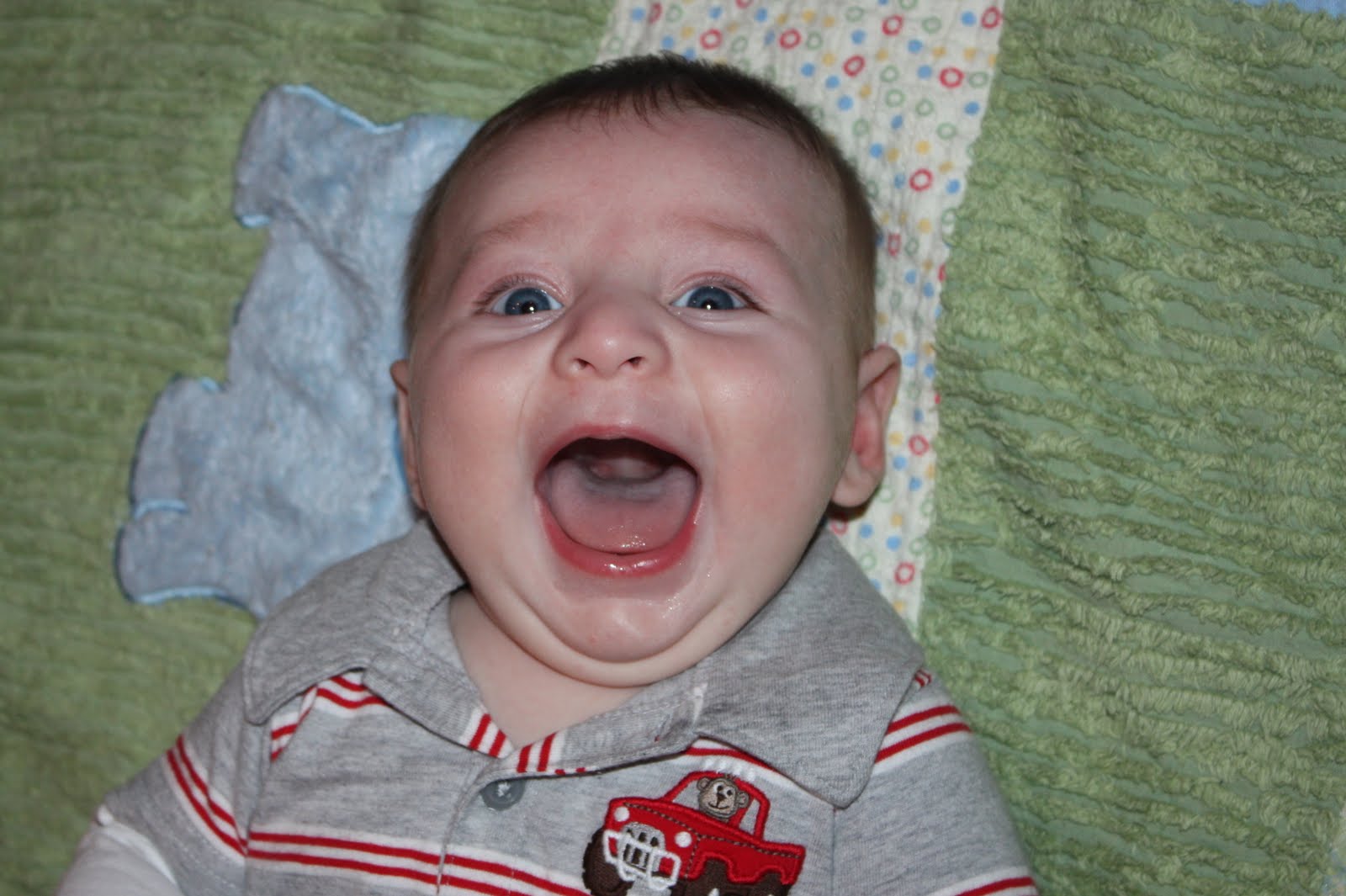 Earlier this week, Lincoln did roll over once. I think it was a fluke though. He has not been able to repeat it...even when I try to talk him into it and Ben demonstrates. However, he is liking being on his tummy a little more. We are also getting into the belly laughing stage....here he's belly laughing ON his tummy!